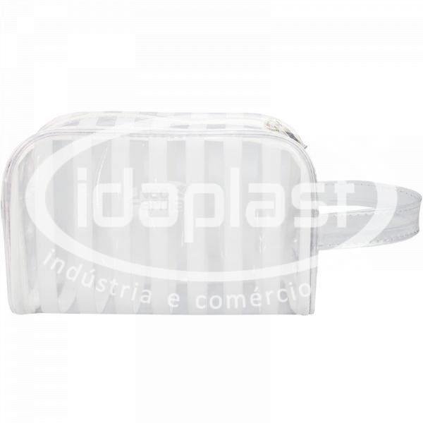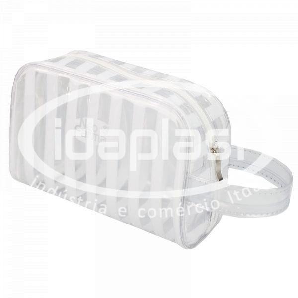 Necessaire plástica personalizada (fabricante IDAPLAST) com alça lateral e fechamento em zíper. Conta com cursor simples ou especial.
