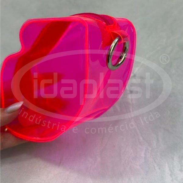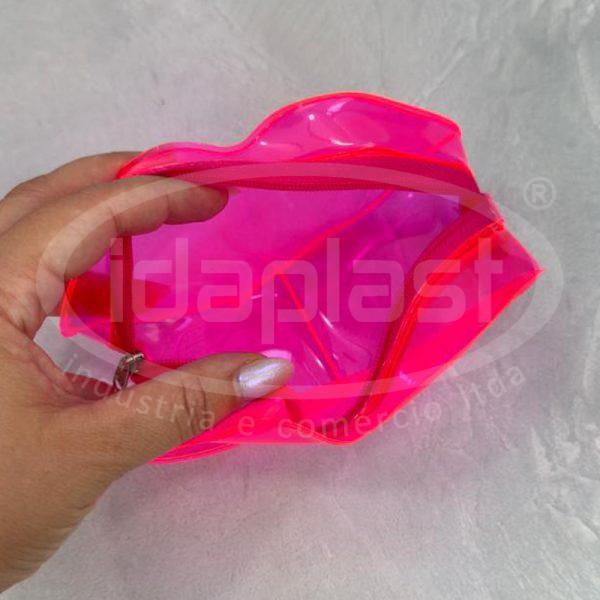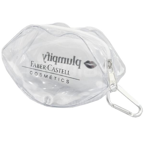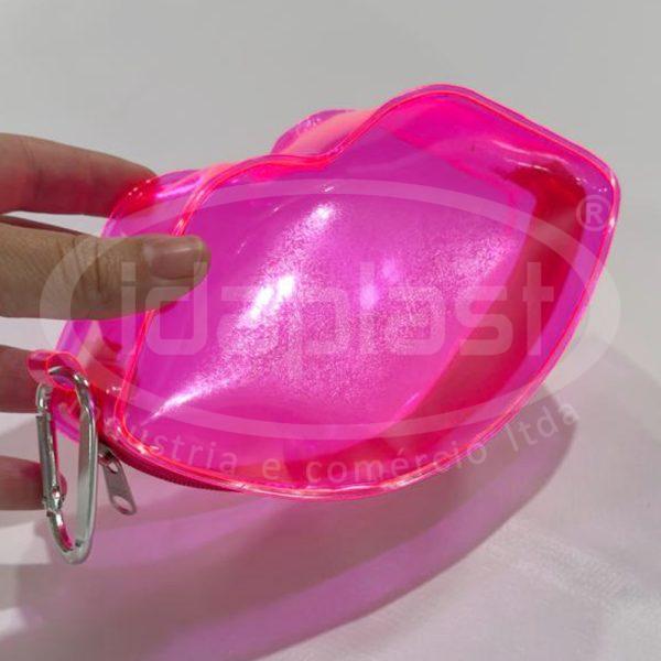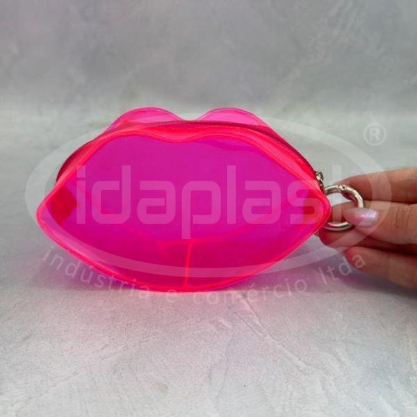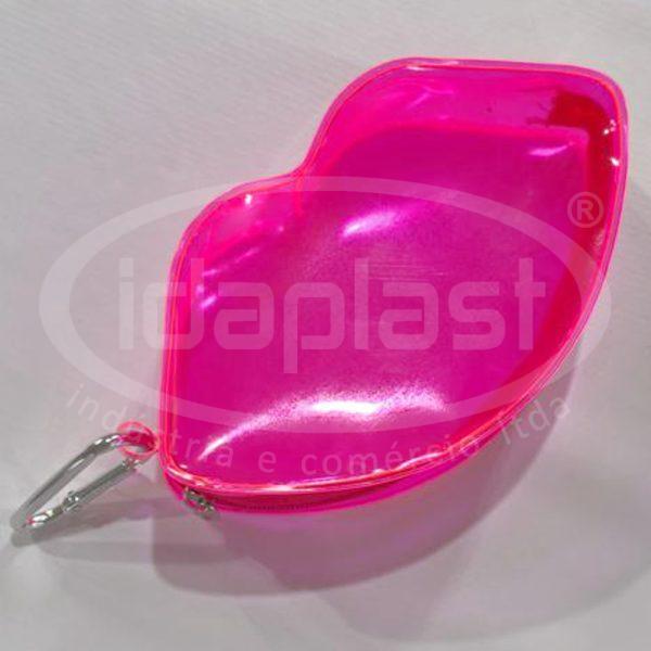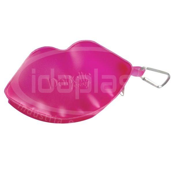 Necessaire boca/beijo com opção de inserção de mosquetão para virar um chaveiro de bolsa. Pode ser produzido em PVC translúcido (várias cores para escolha) ou em PVC cristal color (cores comuns e neon para escolha) ou em PVC transparente.