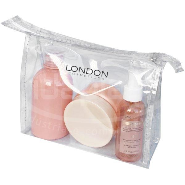 Necessaire tipo embalagem para cosméticos personalizada. Confeccionada em PVC cristal transparente ou colorido. Com zíper, personalize com sua logo!