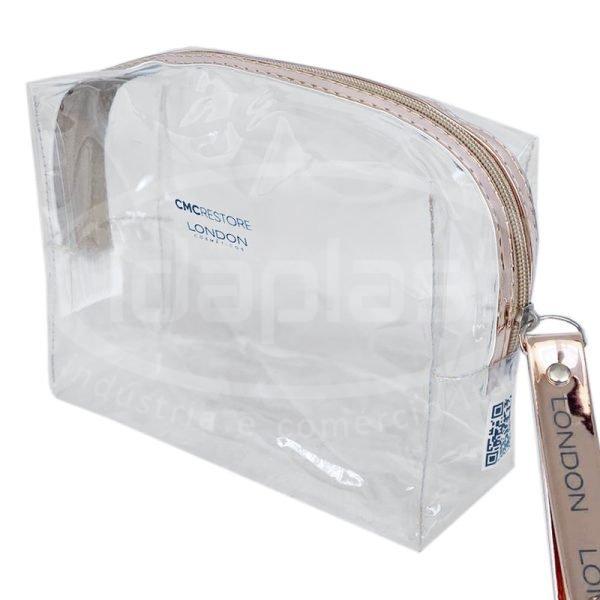 Necessaire personalizada em PVC, ideal para embalagem plástica de seus produtos! Com detalhes em material sintético (diversas cores para escolha) e alça lateral. Monte a sua com seu consultor!