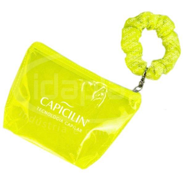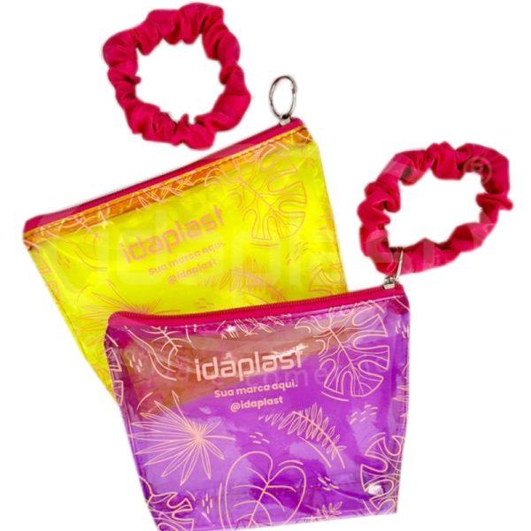 Necessaire confeccionada em PVC cristal coloriodo (neon) ou transparente. Com possibilidade de ser confeccionado em nylon (tecido) maleável. Conta com scrunchie de cabelo que pode ser personalizado. Brinde 2 em 1! Com diversas opções de cores para zíper, PVC e scrunchie! Monte a sua com seu consultor.