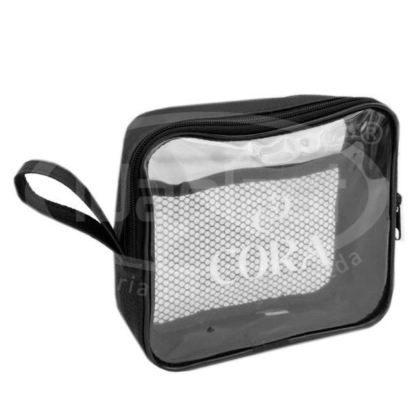 Necessaire confeccionada em PVC cristal transparente ou colorido. Com opcional de alça lateral e bolso interno em tela. Monte a sua com seu consultor!