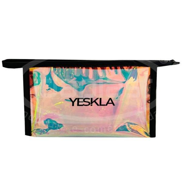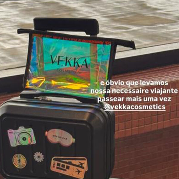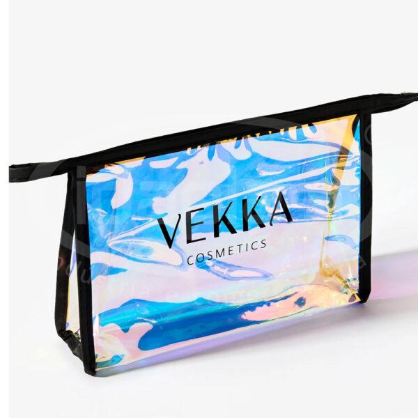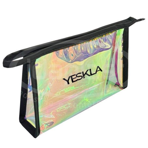 Necessaire holográfica confeccionada em PVC com detalhes em sintético de cor a definir. Fechamento em zíper cor a definir.