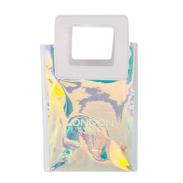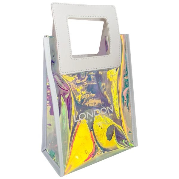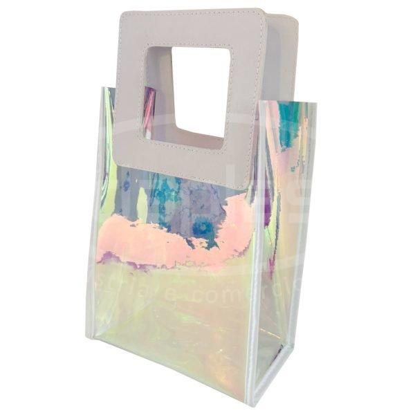 Necessaire em PVC holográfico ou PVC colorido, com alça de mão estruturada em courino sintético (cor a definir).