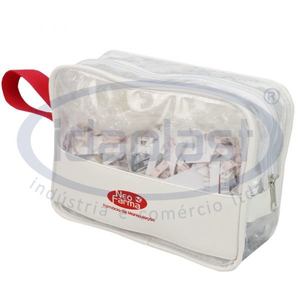 Necessaire plástica personalizada para brinde. Confeccionada em PVC cristal e detalhe em couro sintético (diversos tipos e cores para escolha). Fechamento em zíper com cursor simples ou especial. Alça lateral.