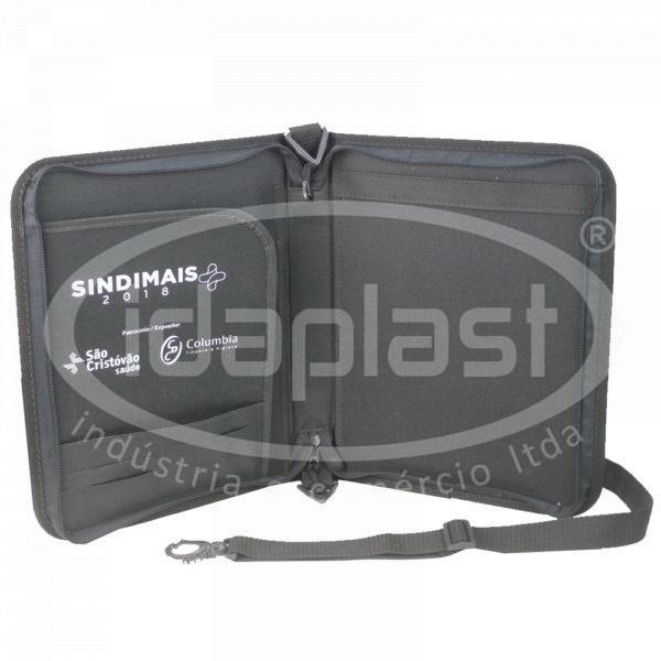 Pasta com zíper personalizada para eventos. Confeccionada em poliéster ou couro sintético (várias cores disponíveis). Conta com bolsos internos e fechamento em zíper com puxador plástico. Conta com porta bloco de notas.