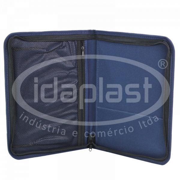 Pasta personalizada com zíper para cursos. Confeccionada em poliéster ou couro sintético. Conta com bolsos internos, sendo um deles em tela e com fechamento em zíper. Acabamento costurado. Ideal para exposição de projetos, eventos e cursos!