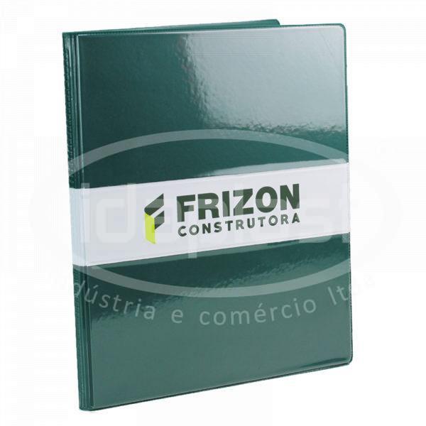 Pasta catálogo personalizada confeccionada em PVC ou courino sintético (diversas cores disponíveis). Conta com visor externo para identificação de conteúdo (na frente ou verso da pasta). Acompanha 4 parafusos niquelados ou plásticos e opção de inserção de 35 sacos plásticos de polietileno.