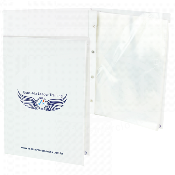 Pasta catálogo personalizada confeccionada em PVC com opção de revestimento em PVC cristal. Conta com parafusos de metal ou plásticos, à escolha do cliente. Possibilidade de inserção de visor frontal e sacos plásticos. Acabamento em solda eletrônica.