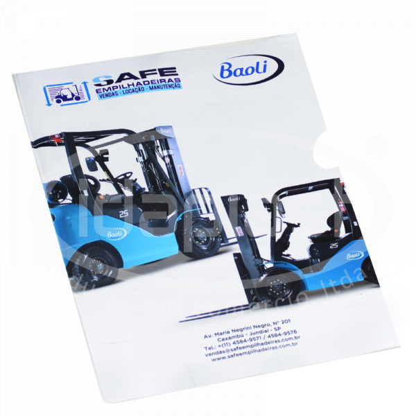 Pasta L personalizada tipo envelope. Confeccionado em PVC, é ideal para organizar e apresentar documentos. Opcional de visores e unheiro (detalhe que facilita a abertura da pasta).