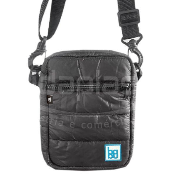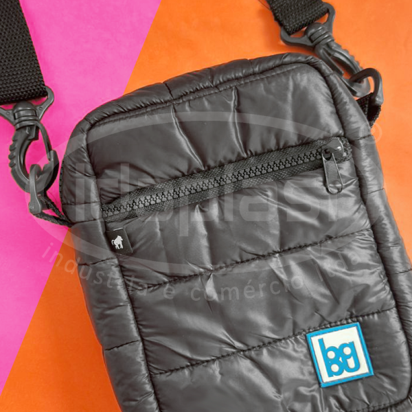 Shoulder bag confeccionada em material almofadado puffer, mas pode ser também fabricada em outro tipo de material (poliéster ou courino). Com alça tiracolo removível, acessórios plásticos ou niquelados. Com zíper especial trator ou comum. Forro interno.