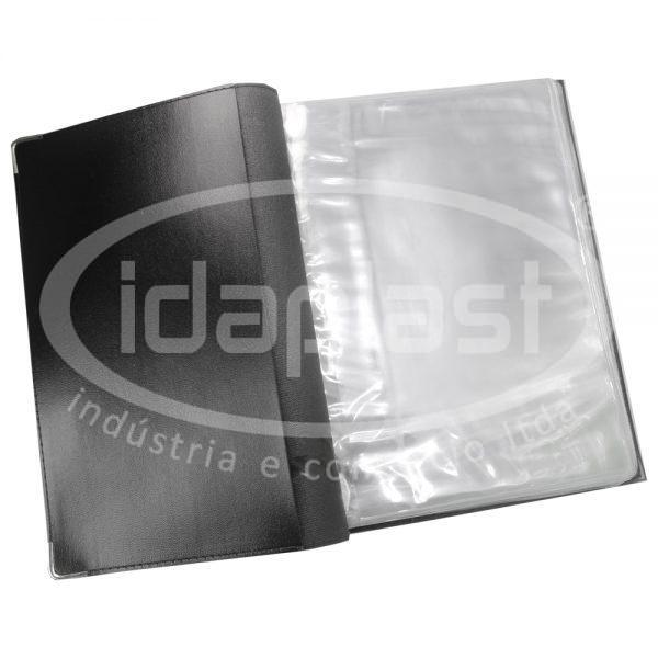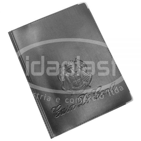 Pasta tipo catalogo confeccionada em couro sintético com 14 envelopes em PVC transparente espessura. Com 2 cantoneiras.