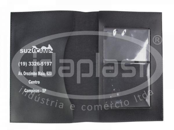 Porta manual de veículos em couro sintético. Com dois bolsos internos para inserção da capa do documento principal e dois bolsos em PVC transparente sobrepostos para inserção de cartão e outros informativos.