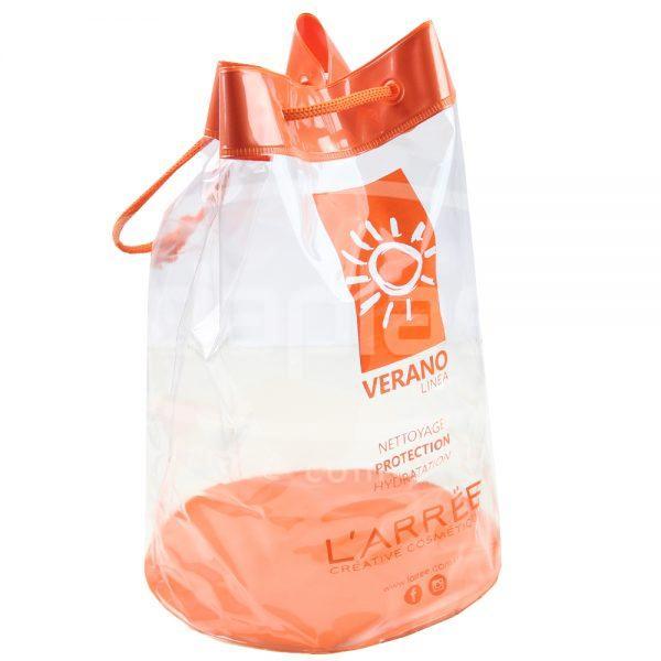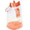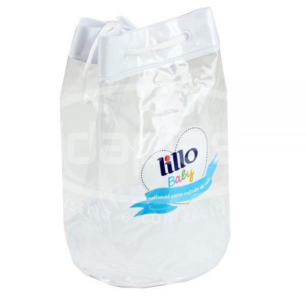 Mochila plástica tipo necessaire com cordão confeccionada em PVC cristal. Pode contar com tarja e/ou fundo colorido. Ideal para embalagem personalizada!