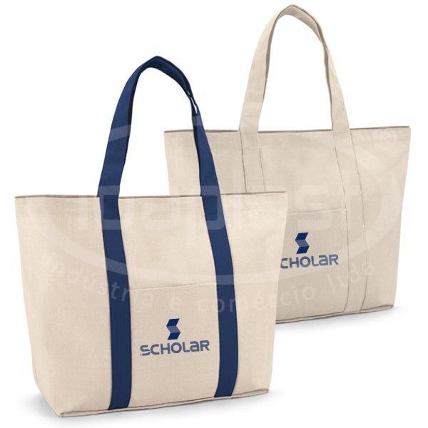 Sacola 100% algodão grosso (280 g/m²) com bolso frontal e bolso interior com zíper. A sacola contém fecho magnético e alças de 60 cm.