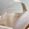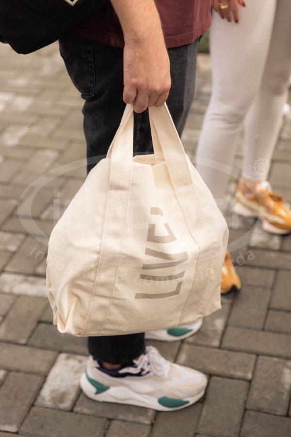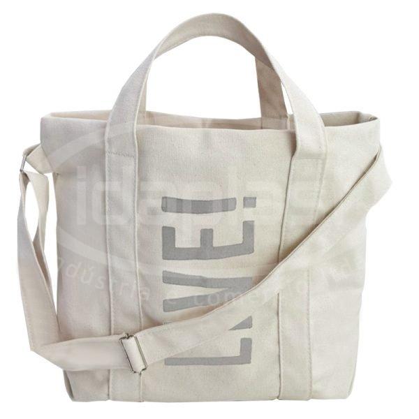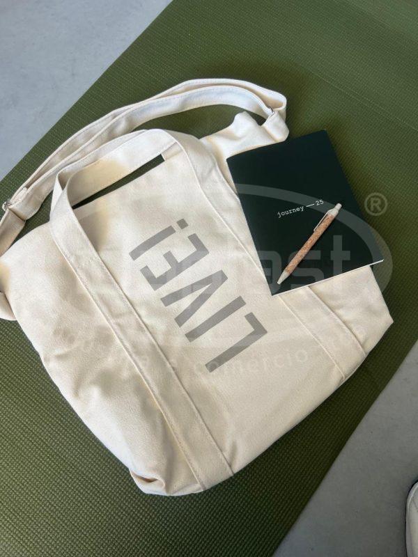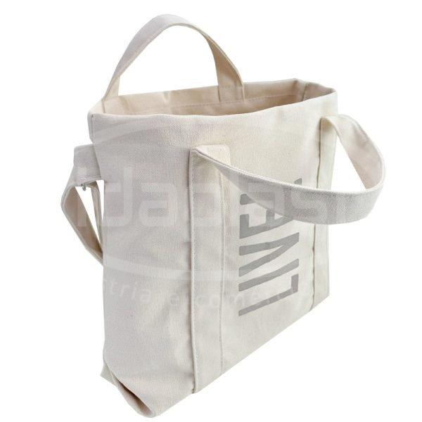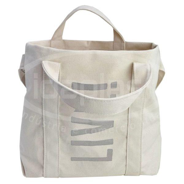 Sacola ecobag em lona grossa crua. Com alça de mão e alça tiracolo fixa no mesmo material. Forro interno.
