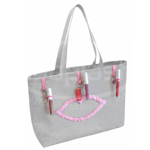 Sacola em lona grossa (100% algodão) ou poliéster, personalizada. Com opcional de forro interno. Alças no mesmo material. Sugestão de personalização via logo texturizado em pelúcia alto relevo e suportes para bag charms. Monte a sua com seu consultor!