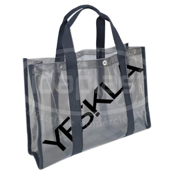 Sacola em PVC (cristal, translúcido, neon, colorido… diversas cores para escolha!) e alças em correia comum. Com fechamento em botão de metal dourado ou niquelado. Monte a sua com seu consultor!