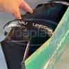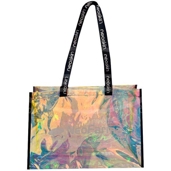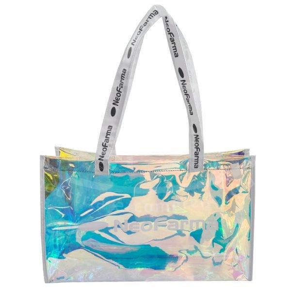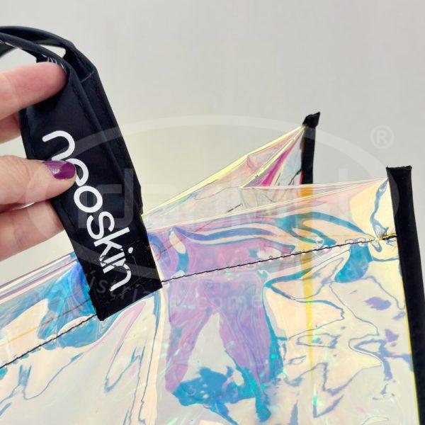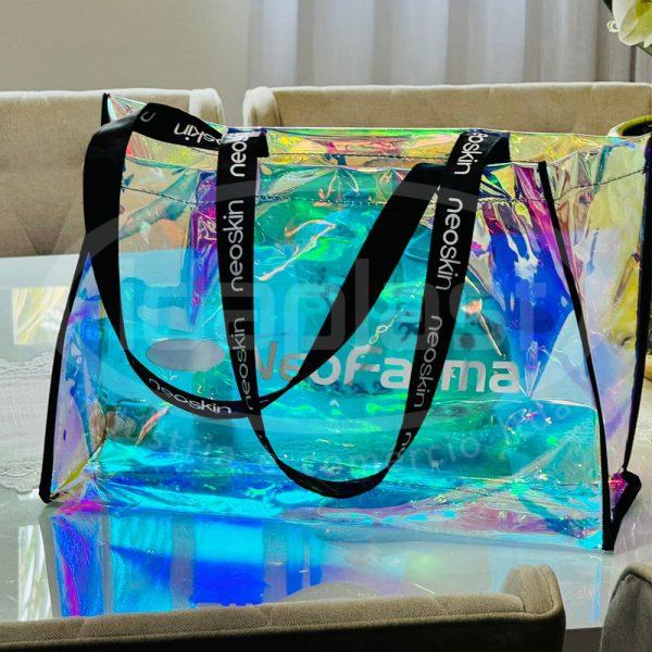 Sacola personalizada (ideal para eventos) confeccionada em PVC holográfico (muda de cor conforme luz incidente na peça), cristal transparente, translúcido ou colorido. Com alças personalizadas ou não. Opção do verso da peça (parte de trás) sem em nylon. Monte a sua com o seu consultor!