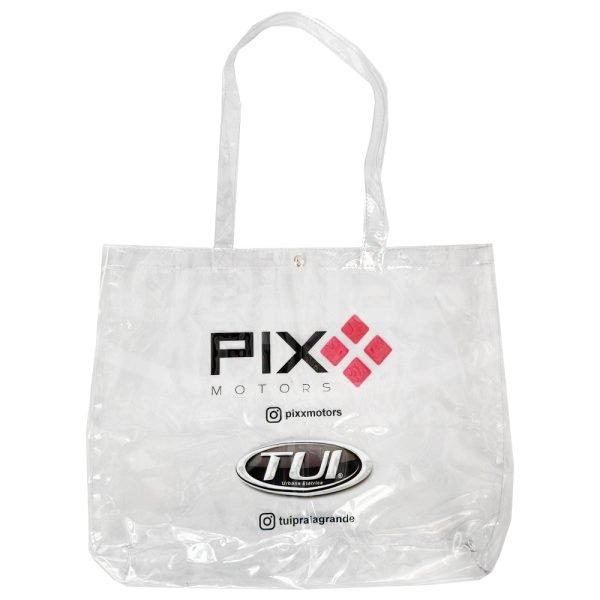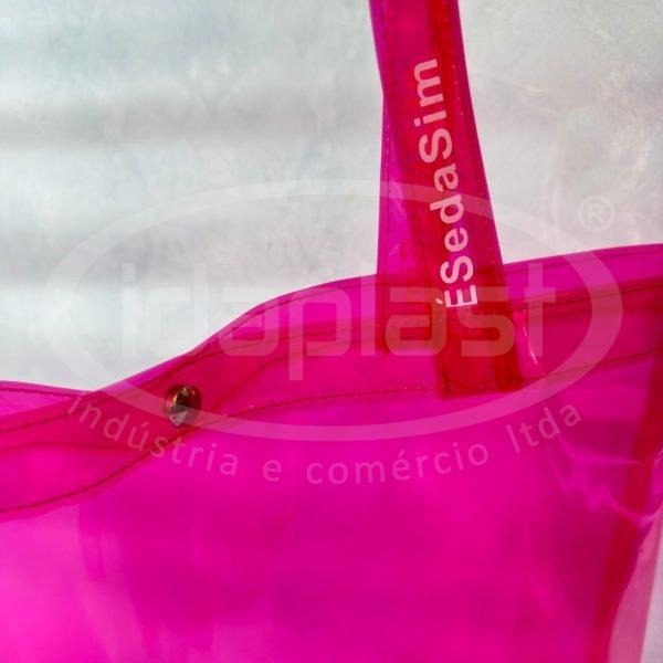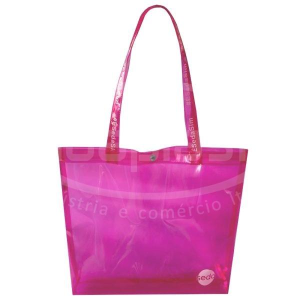 Sacola plástica personalizada. Em PVC transparente, colorido, neon… Com fechamento opcional em botão.