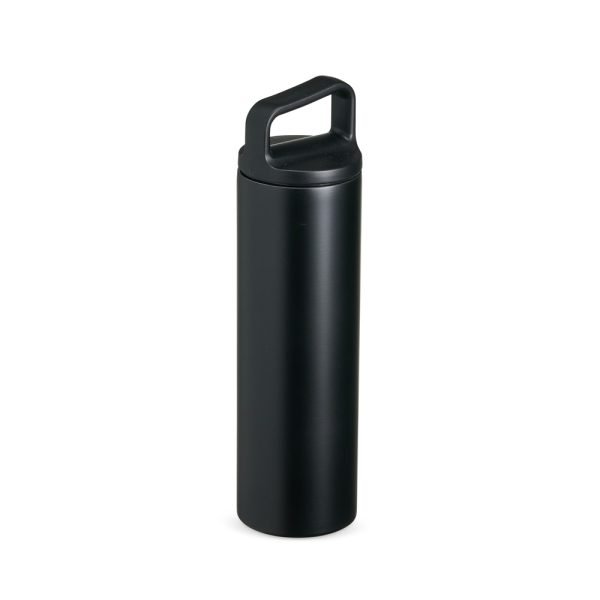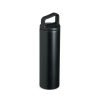 Garrafa térmica em inox, com parede dupla e capacidade de 600ml. A tampa é plástica rosqueável e possui alça acoplada.